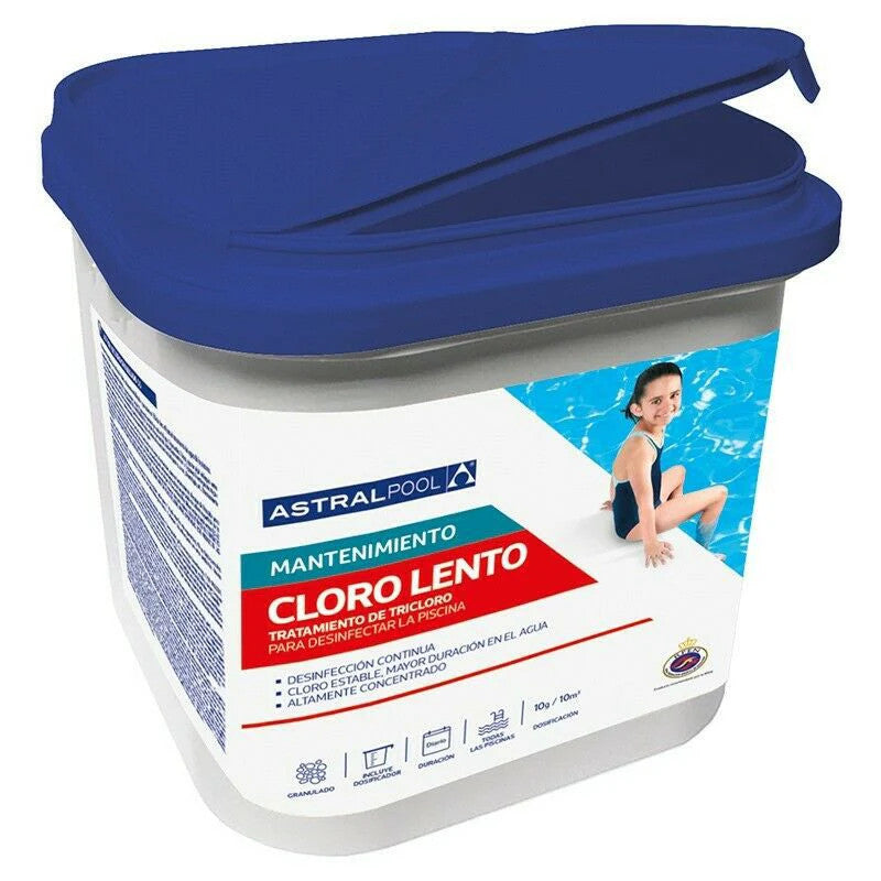 Cloro granulado de acción lenta en formato grande, adecuado para el mantenimiento regular de grandes piscinas.